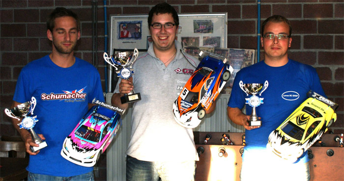 The Superstock guys were also very fast on this nice track. Nick Logie would be the man to beat on his home track. Nick, a bit sick on Saturday, took the pole in front of Stephan Roufosse and Marc Tebaldi on the third spot. Overall series leader Geoffrey Vekemans was starting from sixth place. The first final was a walk over for Nick Logie. Stephan Roufosse had bad luck and Geoffrey Vekemans had to come from sixth place to take second place. Werner Broeckx took the third place in front of good old Michel Mahieu. In the beginning of the second final we saw Nick Logie run away from Stephan Roufosse but in lap 12 Nick made a mistake and Stephan Roufosse came back with Marc Tebaldi just behind. Nick kept the lead and took the win in front of Stephan Roufosse, Marc Tebaldi and Cédric Gils. The third final was a formallity for Nick Logie but he want to drive. Nick made a little mistake half way and Stephan Roufosse took the lead and the win in this last final. Nick took second and Renaud Gysembergh, who had bad luck this weekend, took the third place. The overall win was for Nick Logie (Xray T2009), second Stephan Roufosse (Tamiya 416) and third Geoffrey Vekemans (Schumacher Mi4).