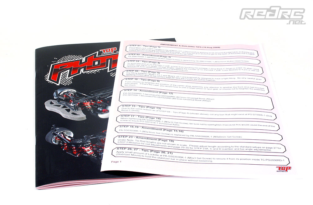 The build starts with the front and rear ball differentials. The manual supplied with the kit consists of CAD drawings, parts lists and comments for both versions so please make sure you pick the correct steps for your type of chassis. Also supplied is an amendment and build tips sheet so building the Photon needs a bit of concentration to not mix-up things especially in the later stages of the suspension build.