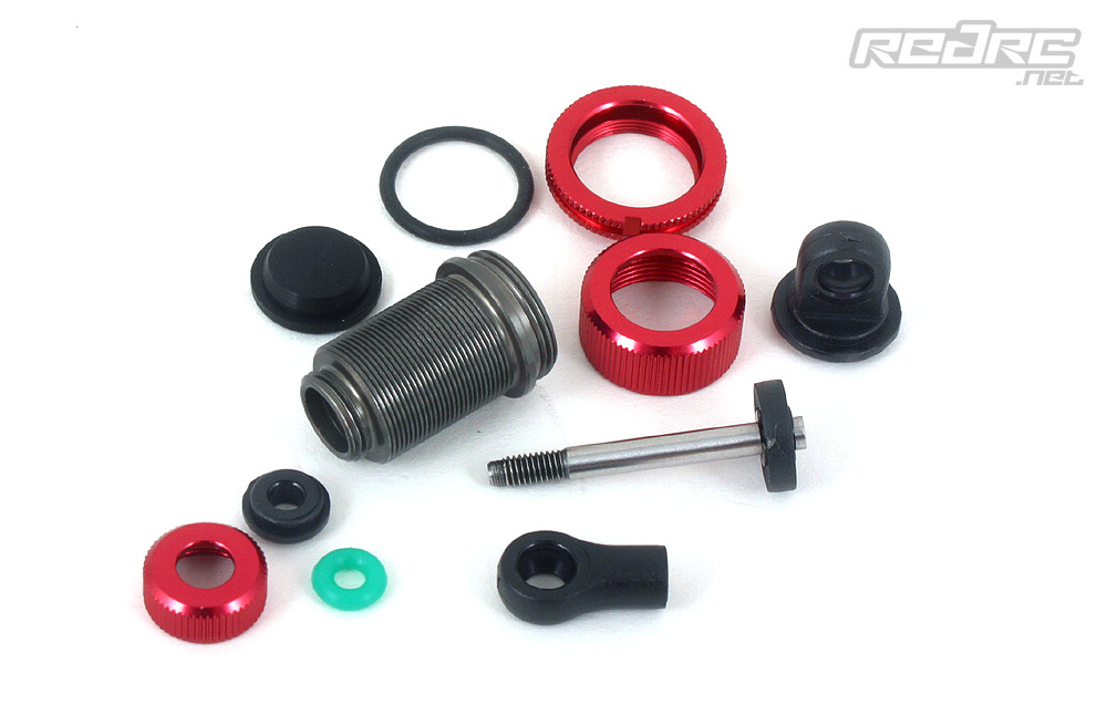 The front and rear shock towers are cut from 3 mm thick CF and sport six and five different mounting positions respectively to attach the upper part of the oil filled shocks. These come with threaded alloy shock bodies, red anodised upper and lower caps and a single O-ring cartridge. Supplied with the kit are a total of four different two or three hole shock pistons with 1.0 mm or 1.2 mm holes.