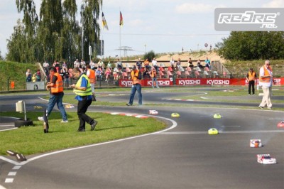 In his third heat Robert Pietsch managed 16 laps in 5.08,450 minutes to take pole position and to beat Dirk Wischnewski (Xray/Orcan) who did 16 laps in 5.11,624 in heat one. In the last heat Thomas Guensel came really close to Wischnewski with 16 laps in 5.11,884. The last spot as a direct qualifier was captured by Patrick Gassauer (Kyosho/Team Orion), winner of the German 1/10 EFRA Grand Prix, with 16 laps in 5.14,404. Beside these four racers, only Rico Kroeber (Xray), Daniel Thiele (Mugen), Toni Gruber (Serpent), Patrick Schaefer (Shepherd), Manuel Singer (Xray), Michael Salven (Serpent), Eric Dankel (Xray) and Kai-Oliver Guttschau (Mugen) completed 16 laps to claim positions five to twelve.