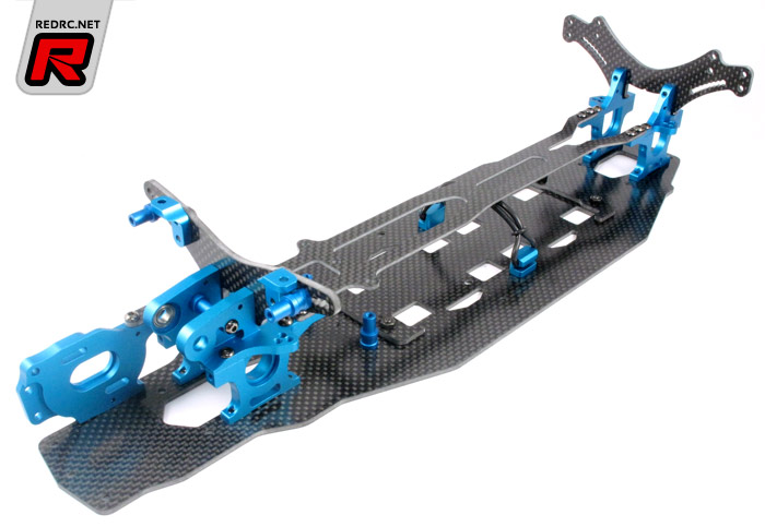 Over 6 months in development by former World Champion Surikarn Chaidajsuriya, Huge RC have release the FF11 FF03 conversion. The prototype was used to win this year’s FWD class at the TITC in Thailand, with the design aimed at making the car more rigid, tunable and reliable on the track. The kit features a narrow 2.5mm carbon fibre chassis allowing it to rip through corners as well as a 2mm carbon fibre top deck held in place by 8 screws which can be removed to adjust flex. A new battery mounting system, utilizing an o-ring and aluminium mounts keeps it in place while tape slots allow it to be secured further. Other features include 3mm carbon fibre front and rear shock towers, one piece aluminium front motor mount and blue anodised aluminium lower bulkheads, which are symmetrical in design allowing the bulkhead to be interchangeable front and rear.