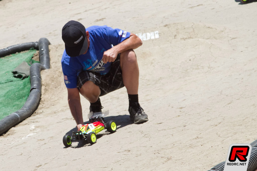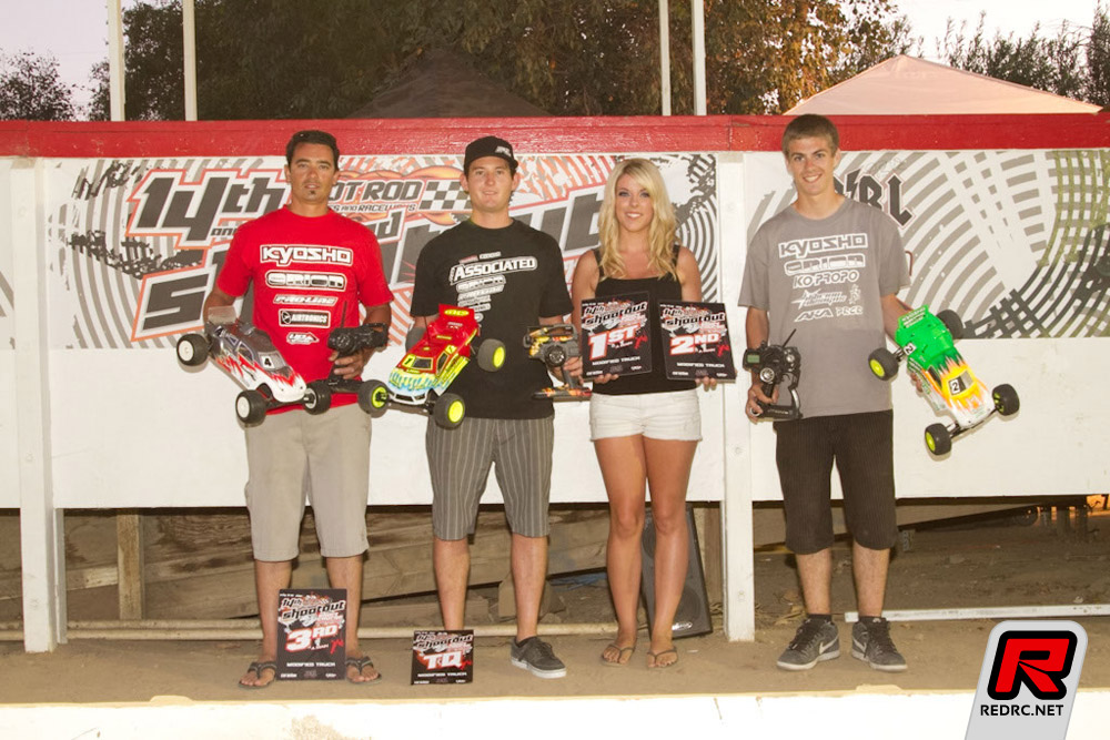 The 14th Annual Hot Rod Hobbies Shootout wrapped up today with some spectacular racing! The track was patched and prepped nicely for the mains by Jimmy Babcock and crew. Traction was unreal, competition was fierce, and the crowd was clearly entertained by their abundance of oohs and aahs. Pro-2 short course kicked off the day with the first round of the triple a-mains. From pole position, Jared Tebo lead the first lap and never looked back in A1. A2 followed suit with complete domination driving his Kyosho RB-5 SC to the victory and clinching the overall win. TLR teammates Mike Truhe and Frank Root had some pretty epic battles for 2nd place, swapping positions what seemed like every corner. Truhe and Root had a rough start in A3, but it didn’t take them long to work their way back to the front where the rivalry continued to entertain the spectators.