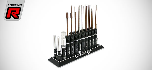 VP-Pro have a new multi-piece metric tool set available, containing most of the needed drivers, wrenches and accessories to build, maintain, setup and run 1/12th to 1/8th scale vehicles. Coming in a VP-branded tool bag and including a suitable stand the set includes 1.5mm to 3mm allen wrenches, 2mm to 3mm ball hex drivers, 5mm to 7mm nut drivers, a 4mm flat head and a 3.5mm Phillips screw driver as well as a 3.5mm arm reamer, a screw head cleaner, an exhaust spring and E-clip remover as well as a body reamer and battery-powerd glow plug igniter. The tools make use of black anodised aluminium handles and they come with hardened tool tips.