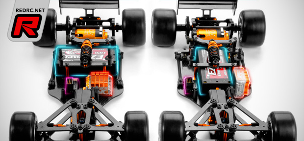 The chassis allows for the use of transverse or in-line mounted 2S shorty LiPo packs with the electronics being mounted in front or to the left and right of the battery pack, depending on the battery placement. Composite battery mounts make for a securely positioned battery while the low-profile steering servo is mounted in a laydown position, acting on a centre single bellcrank steering with optional Ackermann positions.