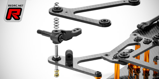 The front suspension is made of carbon fibre double wishbones with the lower A-arms being attached to the chassis via aluminium posts while the upper arms are mounted to a central carbon fibre brace that uses inserts to adjust the camber in a range of 1.0 degree to 2.5 degree while the castor is adjustable from 3 degree to 12 degree, again using different and clearly marked inserts. Additional aluminium shims help with roll centre and ride height adjustments to optimise the steering characteristics according to the track conditions or tyres used. Adjustable composite steering backstops can be used to fine-tune the steering to various track conditions from low to high-grip.