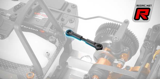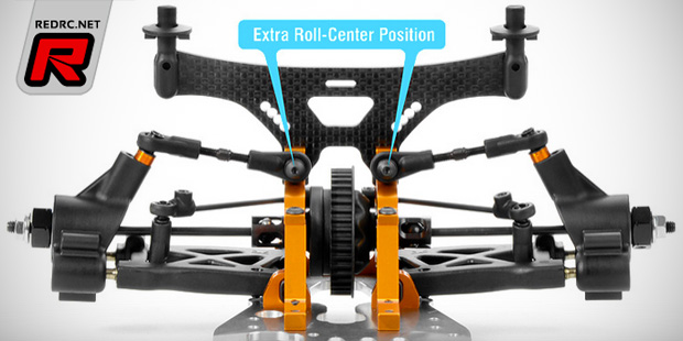 Part of the new drivetrain housing are also all-new upper clamps for the alloy bulkheads. For extra roll centre adjustment possibilities, the rear graphite roll centre bridge with six camber link mounting points can be removed and the rear linkage can be mounted directly to the upper clamps which improves cornering speed and steering in high-traction conditions.