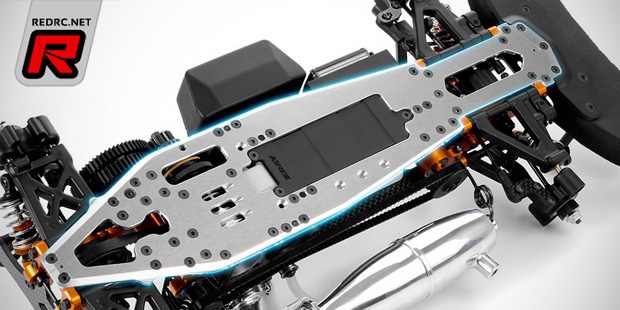The new all-aluminum chassis and bulkhead assembly retains the proven suspension geometry but optimises the flex characteristics to gain maximum traction and steering from the tyres. This is helped by the super-narrow main chassis plate with bevelled edges and airflow cut-outs to help with engine cooling.