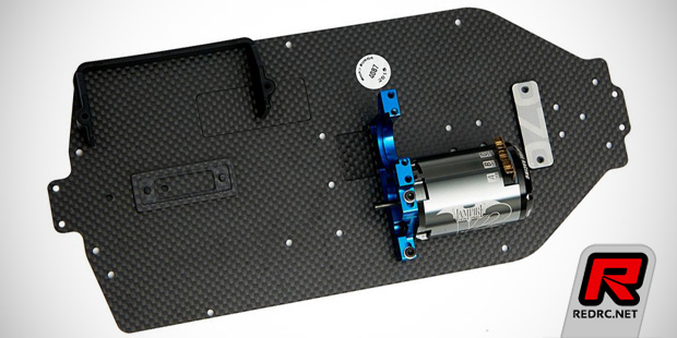 New from DMS Partz and made for the Team Associated B44.3 4WD buggy is a carbon fibre chassis set with Avid balance weights. As used by several of the Team Associated team drivers and also used by Team Associated’s Neil Cragg to TQ this year’s oOple race in the 4WD class the chassis is designed to be stronger and more rigid than the kit supplied aluminium offering, which results in a sharper and more responsive feel to the car. The new chassis gives drivers the option of switching the steering servo to either the left or right position on the chassis with holes provided for both layouts. In keeping with the kit options, forward or rear motor options are available and both saddle or shortly LiPo layouts can be used.
