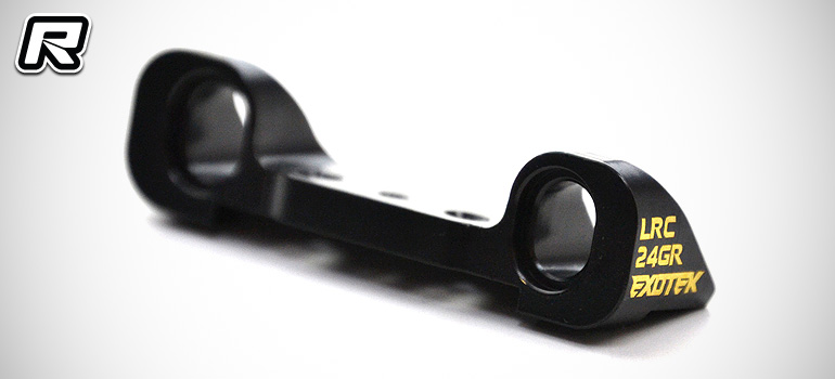 Coming from Exotek and made for the TLR 22 3.0 buggy are several new option parts. First up is the RF LRC suspension hanger made from heavy brass material. The rear front suspension hanger weighs in at 24g and it is of the low roll centre configuration. The part comes black anodised and adds weight in front of the rear A-arms which can increase traction in low to medium-bite conditions.