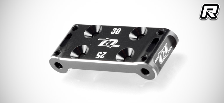 Revolution Design Racing Products’ aluminium front bulkhead for the Team Associated B6 series of 2WD buggies was designed to replace the standard part with a more sturdy and durable item. The bulkhead comes machined from aircraft-grade 7075-T6 aluminium and its directional design allows to run 25 degree or 30 degree kick-up angle while the anodised surface and silver edge details add visual impact. The aluminium part adds rigidity and precision when the point gets tough and when racing on high-bite surfaces. The part fits both the B6 and B6D and it is available in black or blue anodising.