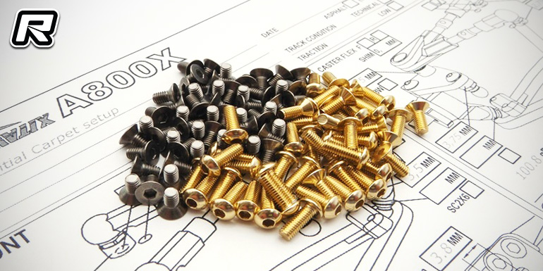 Coming from Hiro Seiko are new lightweight screw kits for the Xray X10 and X12 series of pan cars as well as the new Xpress XQ1 and the Awesomatix A800X. The X10’18 related kits come as mixed aluminium and titanium or full titanium sets that save 15.5g or 12.6g of weight respectively. The X12’18 kits also come as mixed or full titanium sets, scrubbing 15.5g or 12.2g respectively with the mixed sets including orange anodised aluminium and natural finish titanium fasteners. Swinging over to the touring car sets, the fastener kit for the XQ1 saves about 29g for the mixed and 21g for the all-titanium set while the A800X assortments scrub 23g with the mixed and 18.5g with the all-titanium kit. The mixed sets use red alloy screws for the XQ1 and gold-anodised fasteners in the mixed Awesomatix set.