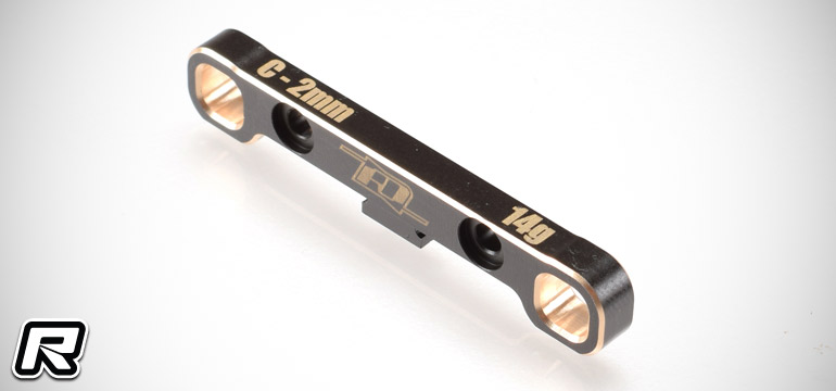 Revolution Design Racing Products have introduced their new brass C and D suspension mounts for the Tekno RC EB410 1/10th scale 4WD electric buggy as well as a dedicated rear brass weight. Starting with the suspension mounts, they are a direct replacement for the kit’s lightweight aluminium part and add valuable weight especially when running in low-traction conditions or when the track is getting bumpier. Machined from black-coated brass and sporting gold-colour chamfered edges the parts, that can be used separately or in combination, shift the weight bias further to the rear which also helps with rotation into corners especially in low traction conditions while improving overall traction at the same time. Available are the standard geometry C and D suspension hangers and also the C-2mm and D-2mm mounts that bring the suspension geometry – and thus roll centre settings – back to standard when also utilising the RDRP0452-2mm EB410 Carbon Fibre Shock Tower Rear -2mm or any other -2mm rear shock tower.