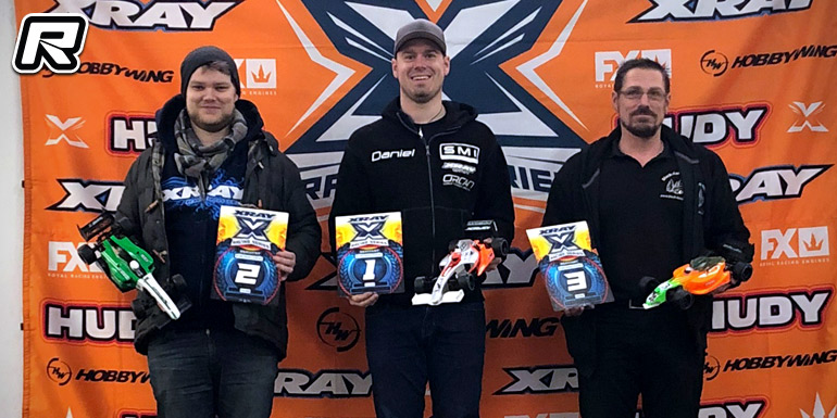 The sixth and final round of the Xray Racing Series Germany was held at the Eifel-Ring at Leimbach, located close to the famous Nurburgring. It was already the fourth XRS appearance in two seasons on the original ETS carpet of this 111-meter track with its challenging mixture of a technical and a fast section. The hosting MAC Adenau club did a great job again and received 53 entries but some had to cancel mainly because of a cold. Lot of racers including five young talents joined the competition which started with ten hours of intense practice on Saturday. In the Touring Car Stock class, a 13.5T Xray motor was mandatory as well as hand-out tyres from Hudy or Volante. Racing was fully under control of Majuran Tharmalingam. The local hero took the TQ as well as all three wins in the A-mains to catch the overall victory. Joerg Baldes, who was 2nd in qualifying just one second behind Tharmalingam, snatched the runner-up spot, four hundredth of a second in front of Melvin Diekmann. Only the top three drivers completed 28 laps during the heats. In the mains Baldes and Diekmann showed thrilling bumper-to-bumper racing with Baldes taking 2nd twice closely followed by Diekmann while he had to retire from the second main due to a malfunctioning ESC. Behind young Marc Stuebben, Tobias Hoeffin finished 5th which was enough to become XRS Touring Stock champion for the second time.