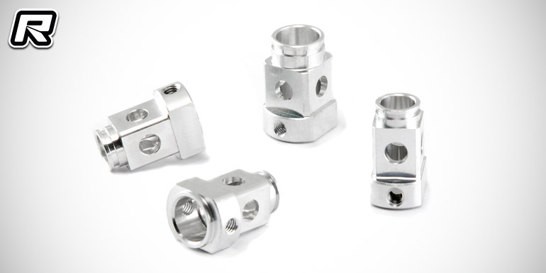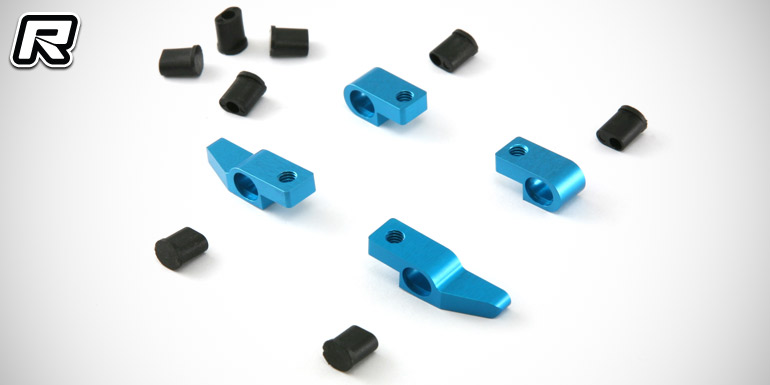 Revised, symmetrical front and rear uprights with mounting holes allow the use of optional carbon fibre aerodiscs and they can now be used on both sides of the car. They also carry the new optional plastic eccentrics and feature additional possibilities for the Ackermann linkage. In the rear optional inserts allow smaller and lighter bearings. Last but not least the rear carbon shock tower and the carbon centring plate had undergone a revision. Excessive mounting holes of the rear shock absorber have been removed and the shock tower has been redesigned to accommodate the new and fresh look of the Velox V8.2. Also the rear body mount has been revised. The hinge pins of the rear body mount can now be secured with a single screw allowing for faster assembly and disassembly.