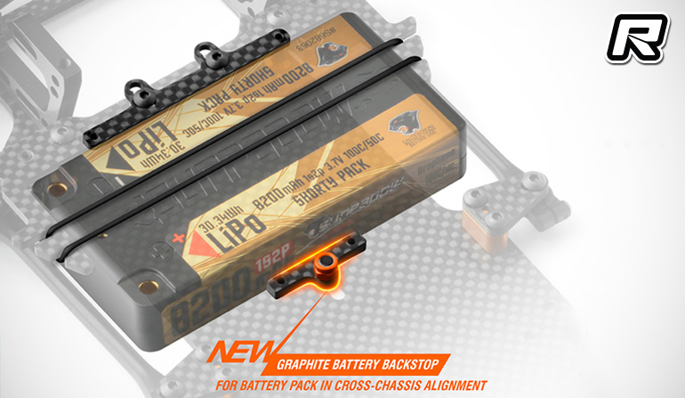 The all-new graphite backstop for the cross-chassis battery alignment alternative is stronger than the previous composite brace for a more secure battery retention. The all-new rear link brace & battery backstop allows for a wider range of battery placement adjustment. The brace includes two holes into which the adjustable battery backstop is inserted. The battery backstop has 4 positions which allow the batteries to be moved more forward. The distance between each position is 2mm, so in total the battery can be moved up to 6mm more forward.