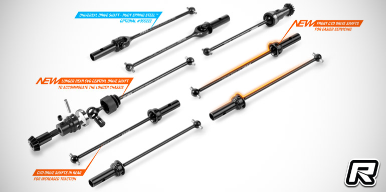 On the drivetrain side of things the 2020 kit features an all-new longer rear centre driveshaft to match the long wheelbase chassis while CV-style Hudy spring steel driveshafts are now included for both the front and rear suspension to assist with increased traction and easier maintenance and servicing. In addition the front steering block ball-bearings are updated to accommodate the CV axles. The central driveshaft assemblies also feature protective rubber boots, thick 3mm pins, and protective locking rings.