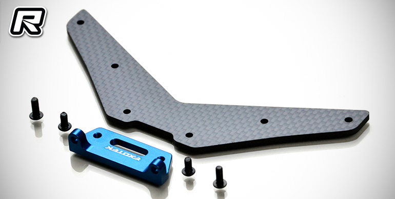Exotek Racing have gone big into the growing drag scene and today have released some goodies for the 2wd Slash and Bandit. First up is this extra long adjustable carbon fibre wheelie bar, which extends from 9.5″ to 12.5″ (axle to axle) to match NPRC race class rules. The longer bar gives you more stability, for straighter and faster passes without needing to let off the throttle as often. You are able to finely adjust the wheel height via the 4mm turnbuckle or make large adjustments by adding spacers under the wheel. Made from heavy duty 3mm carbon fibre with alloy turnbuckles and mounts it includes a ball raced machined alloy wheel with oversized rubber o-ring tire. For the Slash, and also suitable for oval body mounting, is a heavy duty carbon fibre and alloy base body mount set. Extending the body mount back by 28mm and out of the rear windows of most street eliminator cars, the rigid carbon fibre construction ensures less body bounce and flex. Finally there is the new low profile, low ride height heavy duty 4mm thick carbon fibre front shock tower for 2wd Slash street eliminator cars. The lowered tower allows you to mount the body lower and when using Traxxas 4tec shocks it further lowers the front ride height.