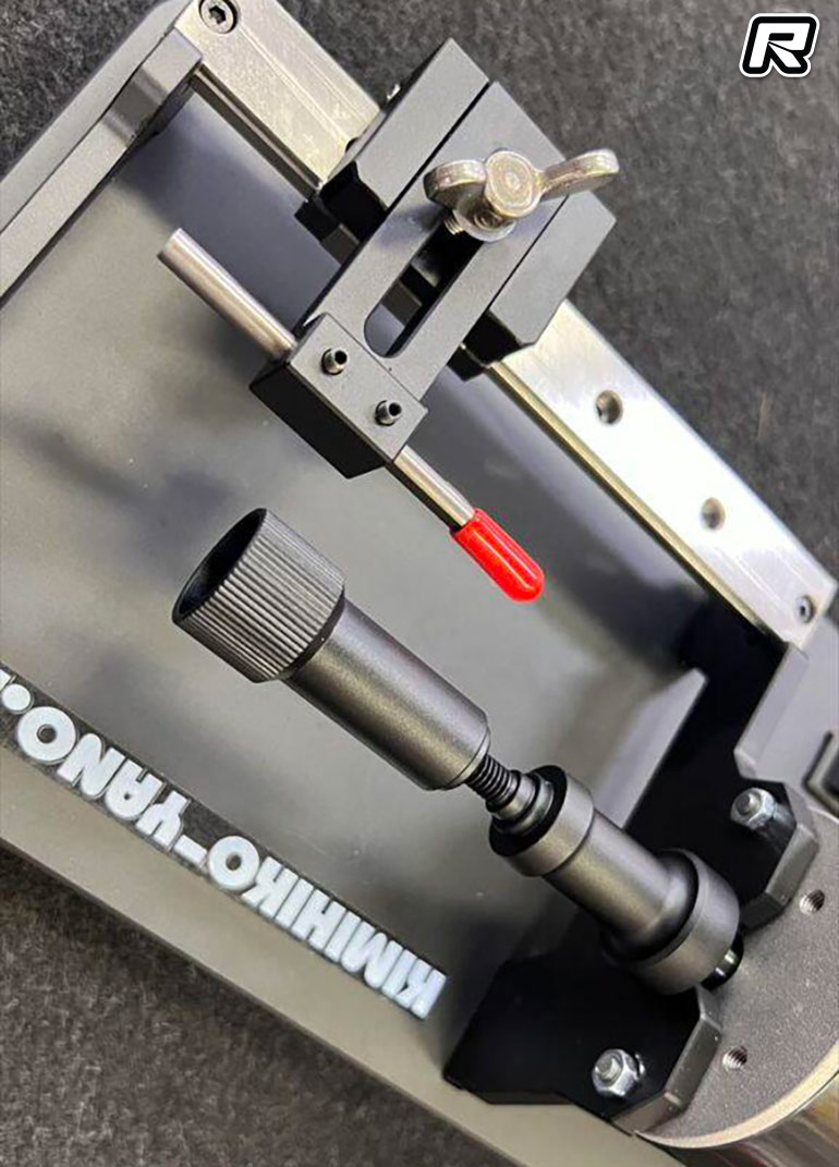 Japanese 1:12 brand specialists Kimihiko Yano has introduced this foam tyre processing machine that is designed specifically for 1:12 tyres. From the planning stage of the product, they interviewed people who have just started using the Twelve, as well as mid-level and expert drivers. Asking them what kind of tire cutter they actually wanted, they continued developing the product in the hope that the introduction of this product will lower the barrier to entry and increase the number of people who will try the twelve. Ideas obtained at the planning stage included making it as compact as possible and minimising the number of parts and emphasise maintainability. Feedback also indicated no need for automatic feed function for the tool and no need for reverse function for the motor. Users also wanted it compatible with hollowing out tires (popping out). A hub that allows you to work with the wheel upside down is required to improve the hollowing out (popping out) accuracy. And after testing two prototypes, the EPS-J Twelve Tire Processor was completed.
