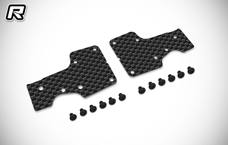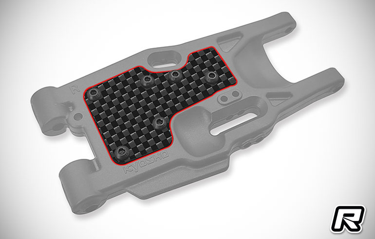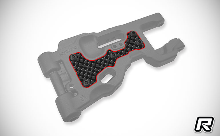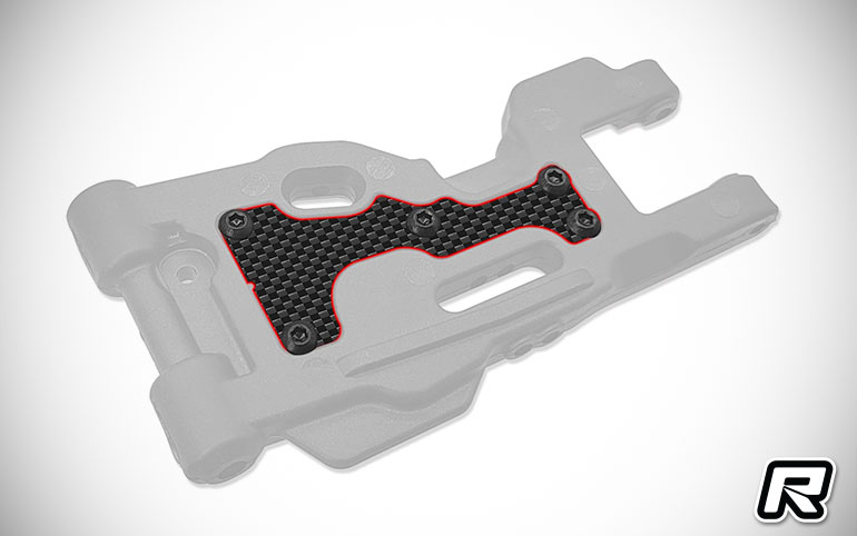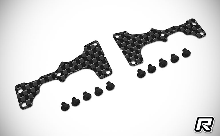 Adding more parts for the Kyosho MP11 1:8 Buggy, T-Works has released front & rear carbon fibre A-arm stiffeners.  The CNC machined inserts are available in two options, 1mm and 1.5mm thickness, for quick adjustment of the suspension A-arm flex.  With an lower and upper insert for the front arms and one rear arm insert, each comes as a pair and include mounting screws.