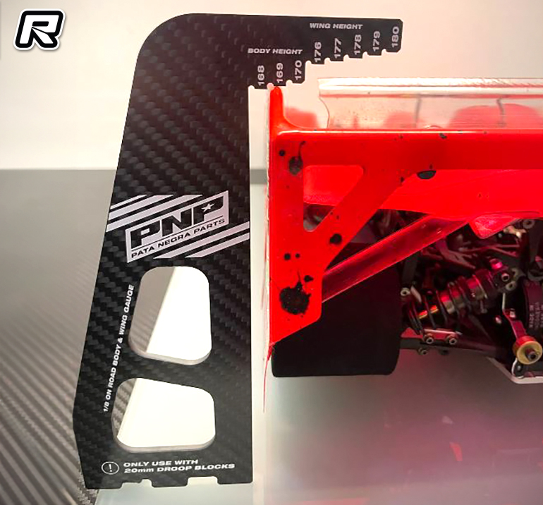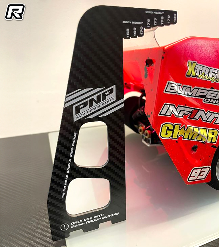 Spanish onroad accessories and optional parts brand PNP (Pata Negra Parts) has created this 1:8 Onroad Body & Wing Gauge. Aerodynamic setup is a key factor in the 1:8 Onroad chassis performance and measuring & checking body and wing height is necessary in order to get the maximum performance. Body rear height highly affects the general downforce (front and rear) generated but also results in more aerodynamic drag while wing height affects a lot the car setup being an easy way to achieve a good balance. Machined from 3mm carbon fibre and finisged with silk printed graphics both side, the PNP Gauge is designed to be used with the car placed on 20mm setup blocks, as it is done in the race technical inspection. Using the gauge, drivers will be able not only to check if their car is legal, but what is more important is that they will be able to measure and share with their teammates these two aerodynamic setup aspects.