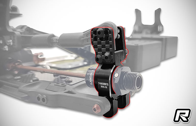 Continuing their roll out of option parts for the Kyosho MP11, T-Works has released these Aluminium Rear Hubs for the 1:8 Buggy.  The 7075 T6 aluminium rear wheel mount has enhanced strength and hardness, improving durability and adjustability.  The top of the wheel mount is connected to the hub with carbon fibre plates which feature multiple adjustments holes.  Matched with different embedded adjustment blocks, it can be adjusted according to different track conditions and the performance requirements of the buggy to optimise handling and stability.