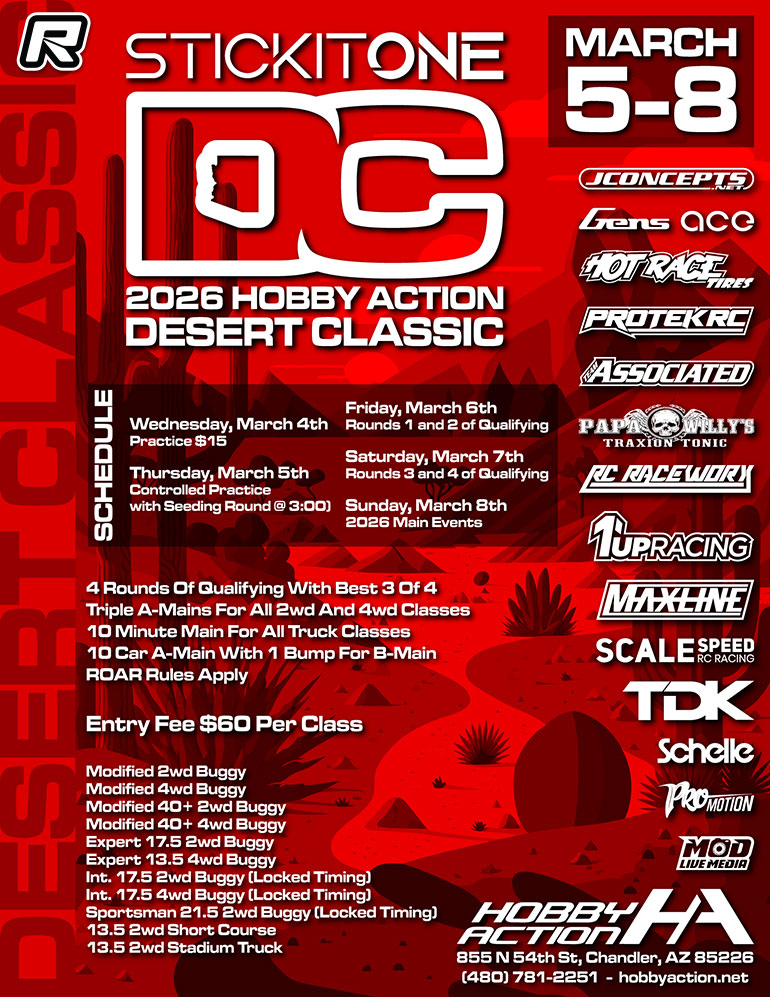 2023 IFMAR 1:10 Offroad World Championship host venue Hobby Action has opened registration for the 10th Annual Desert Classic which takes place at the Arizona indoor track from March 5-8th. Under track owner Larry Tom, the Desert Classic has established itself as an early season fixture on the 1:10 Offroad calendar filling the void left after the iconic Cactus Classic lost its outdoor track location after the 2014 edition. Attracting 32o entries, last year’s edition saw wins for Xray’s Chase Lemieux (2WD) and Team Associated’s Aydin Horne (4WD). Continuing to be supported by long time sponsor Stickit1 Racing, the race schedule will consist of 4 rounds of qualifying with the best three to count with triple finals for all 2WD and 4WD classes and 10-minute Mains for Truck classes.