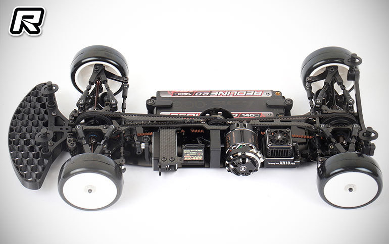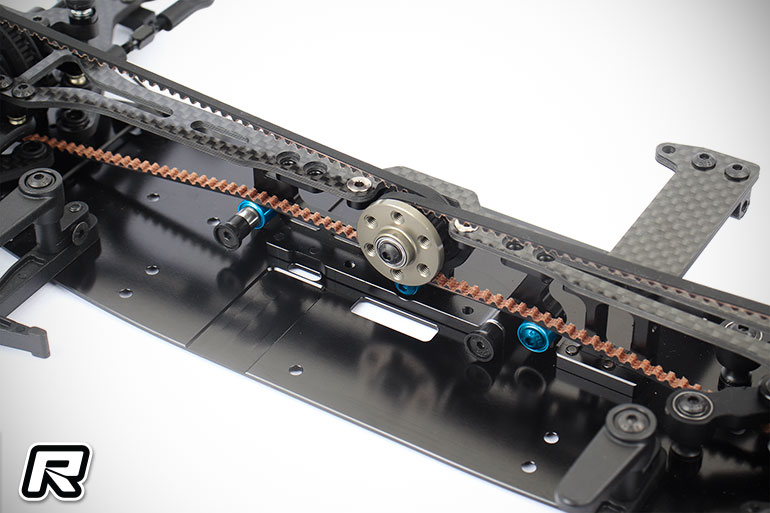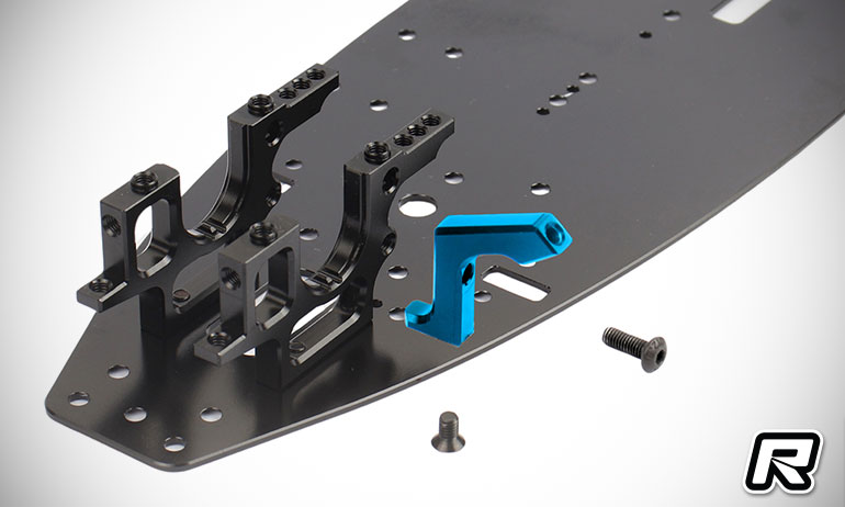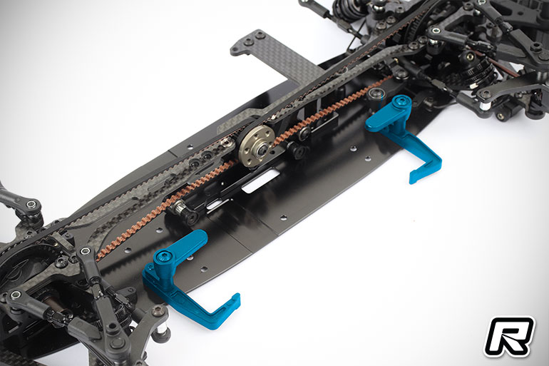The new battery mount makes adjusting the battery tightness easier. Battery tightness plays an important role in the handling of the touring car. The appropriate position can be set with just a few screws and shims in the battery mount. The all-plastic battery mount further reduces the weight on the right side of the car to facilitate the use of large-capacity lipo batteries.New Up-Stop function