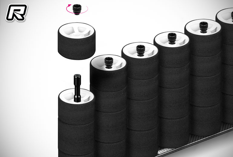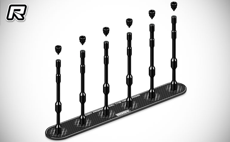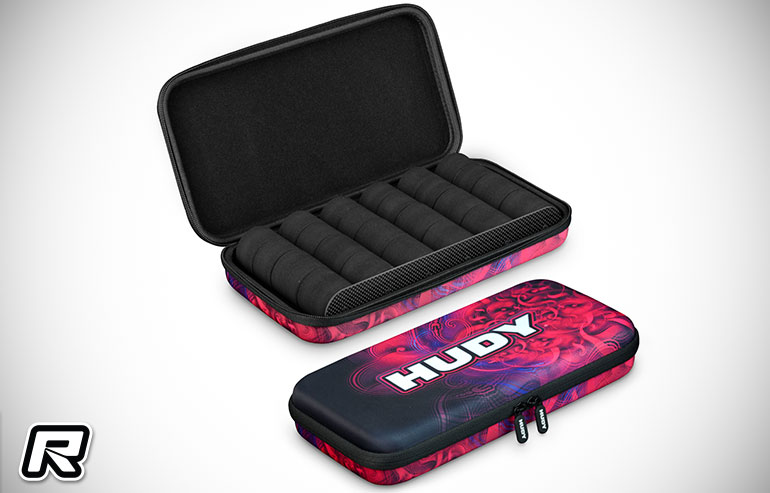 Rolling out more accessories, tool manufacturer Hudy introduces this 6 set Tyre Stand + Hard Case intended for 1:12 Pan Car and 1:12 GT racers. The highly functional stand keeps your pit space tidy and makes it easy to track your various tyre sets and comes complete with a Hudy hard case bag for convenient transportation and safe storage. Made from premium CNC-machined USA carbon fibre, the stand is finished with Hudy graphics. The stand includes six aluminium stands and six aluminium nuts with screws for quick and secure tyre attachment to accommodates up to six 1:12 Pan Car or 1:12 GT tyre sets.