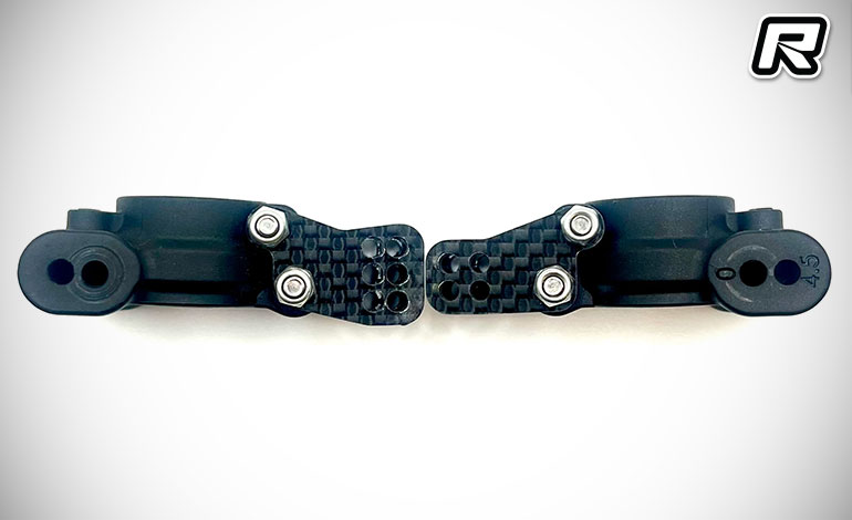 New from Kurt Wenger’s Schelle Racing Innovations brand comes these 2-Row Mid Set Carbon Hub Towers for the Team Associated RC8B4.1 1:8 Buggy platform.  Made from 3mm carbon fibre, the width of hole locations is a split with 2 holes on either side of centre   location.  Run the shorter location with softer springs, and then the mid height as standard, then add the tall setting to limit side to side roll in rear, and get more steering feel to the front.  For many cases the longest link on these is the best grip/stability but with softer springs you may want to go even shorter.