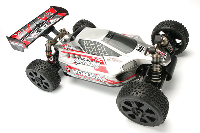New from HPI Racing is the electric powered Vorza, a 1/8th scale buggy based off of the World Championship winning HB D8. Complete with HPI’s proven Flux Blur ESC and Tork motor, all yuo need to do is add your battery packs of choice. The Vorza is packaged as a complete and competitively priced ready to run buggy that will satisfy the needs of any basher or entry level racer. Featuring a bullet proof drive train that consists of front universals, front, centre and rear fluid filled differentials and a hardened steel spur and pinion gear make for a car to take the harshest of demands. The car also sports 16mm big bore aluminium shocks with threaded bodies, fully adjustable suspension blocks, adjustable camber and toe, and event sway bars at both the front and rear of the car.